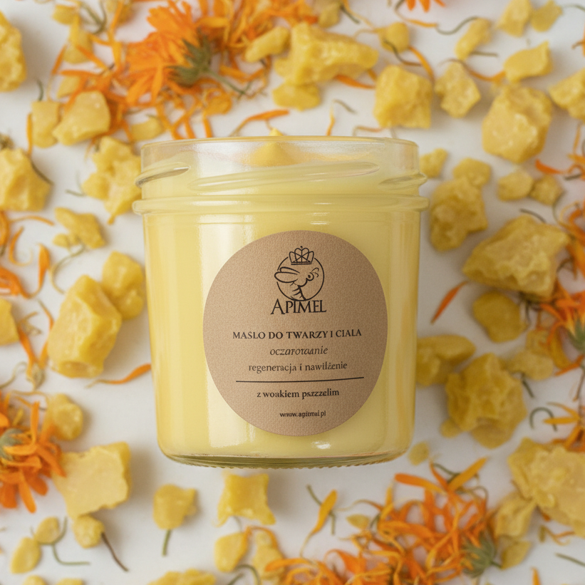 Bogate w karoten, odżywcze, naturalne masło do twarzy i ciała z woskiem pszczelim o ciepłym, głębokim, otulającym aromacie i konsystencji musu